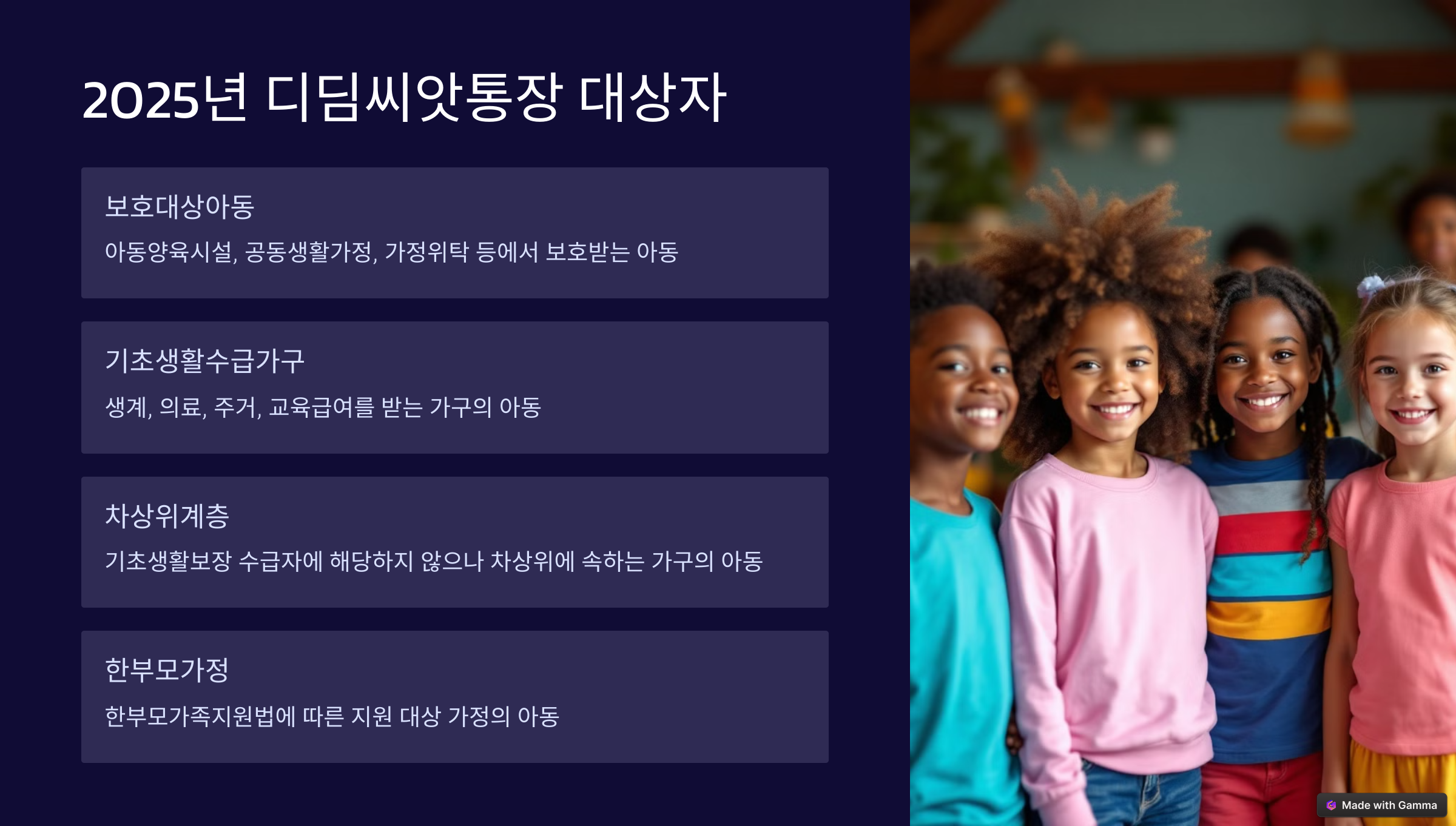 디딤씨앗통장은 특정 조건을 충족하는 아동들에게만 지원돼요. 기존에는 보호아동과 기초생활수급 아동만 신청할 수 있었지만, 2025년부터는 중위소득 50% 이하 가구 아동까지 포함되었어요! 🎉