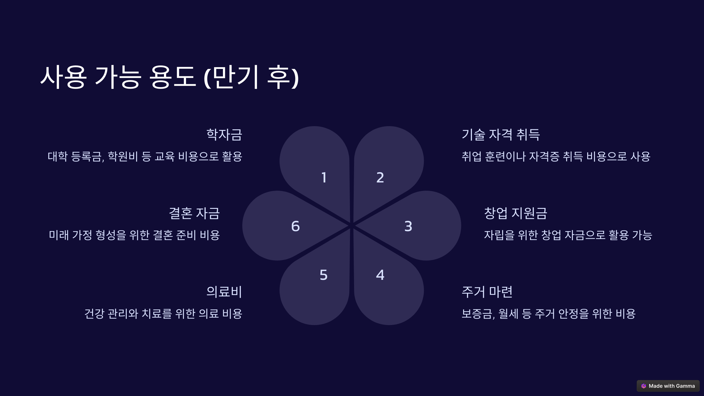 | 사용 용도 | 학자금, 주거비, 취업 준비, 창업, 의료비, 결혼 비용 등 |