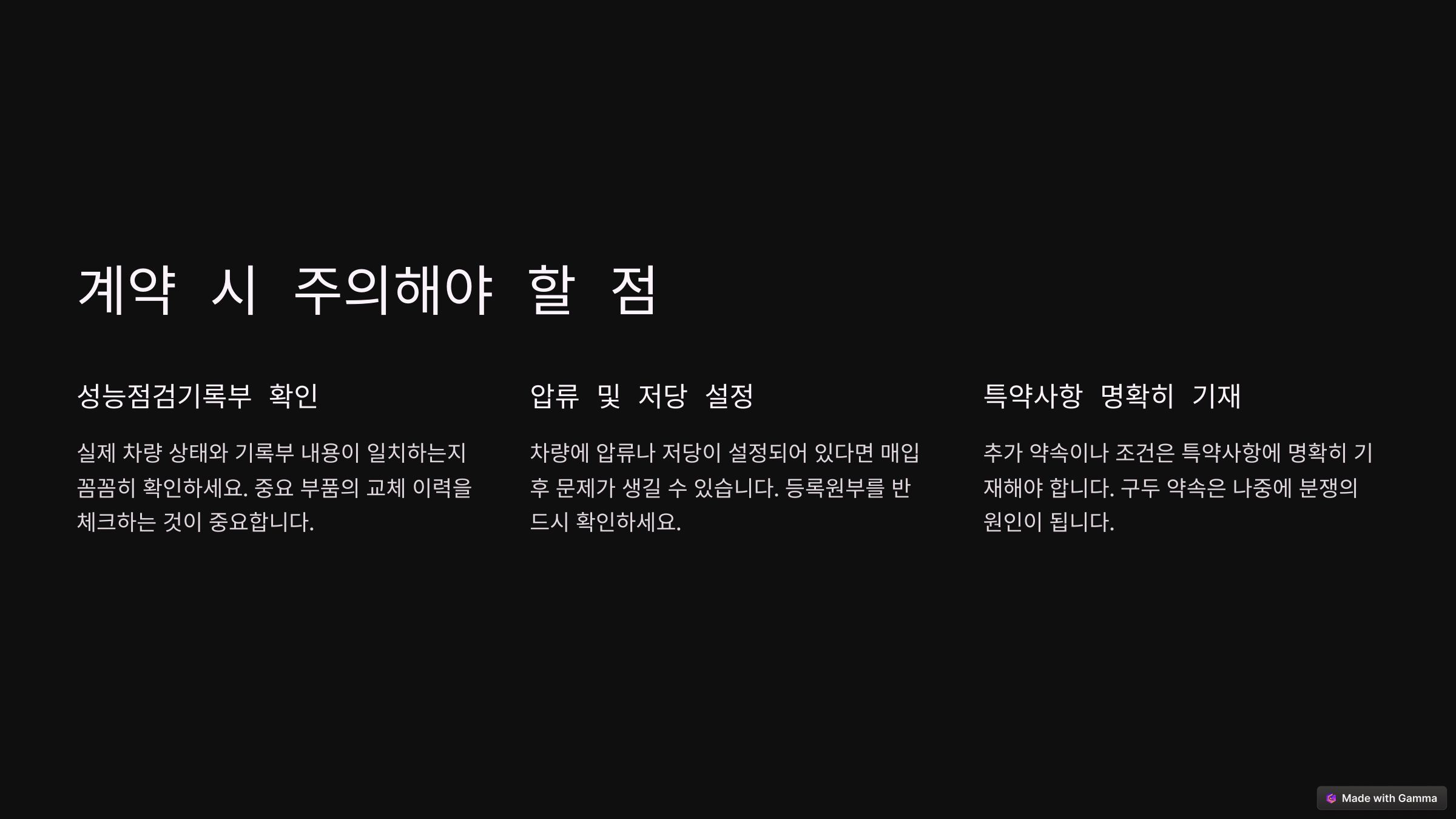 📌 계약서에 차량의 세부 상태(예: 타이어 마모도, 엔진 상태 등)를 적어두면 불필요한 분쟁을 줄일 수 있어요.